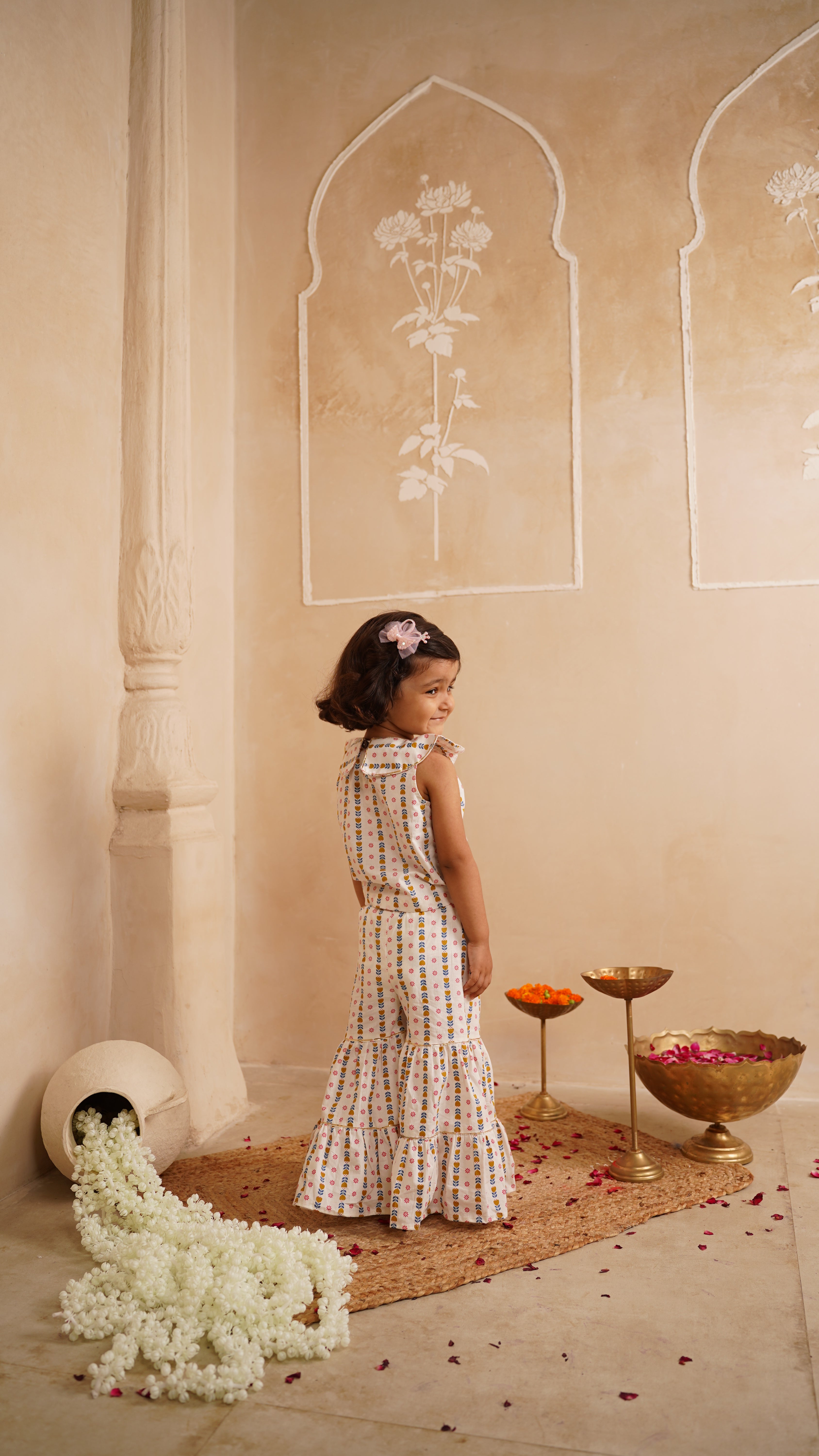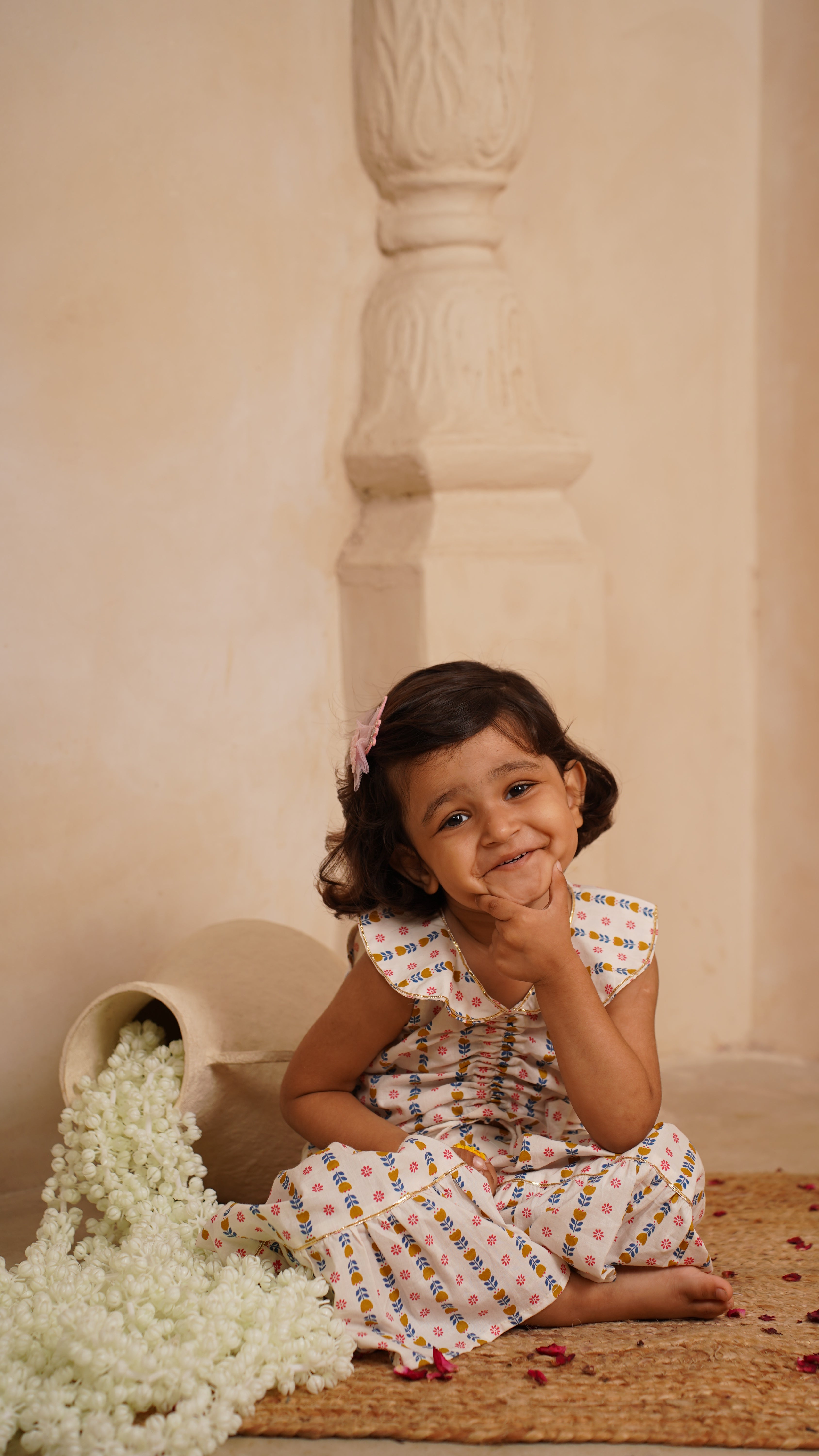 Let your little one shine in this adorable Daisy sharara set, designed for comfort and cuteness. Crafted from soft, breathable cotton, this outfit features a sleeveless ruched top with ruffle details and matching tiered pants. The charming all-over print adds a playful touch, perfect for festive celebrations, family gatherings, or casual summer days.