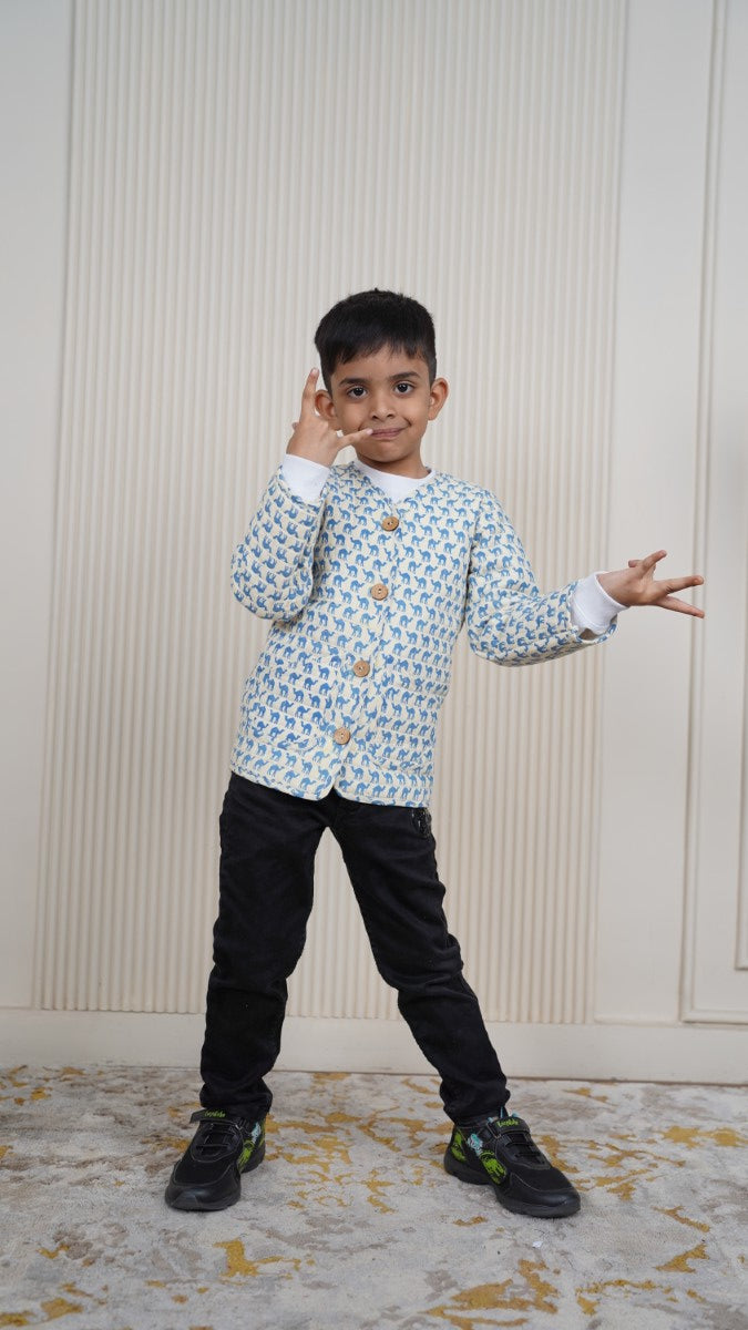 Give winter a playful twist with this cozy and stylish Blue Safari quilted jacket. Made with soft padding and a skin-friendly lining, it keeps kids warm without feeling bulky. The charming blue animal print and premium wooden buttons add a fun yet classy touch, making it perfect for festive occasions, winter outings, photoshoots, and everyday wear.