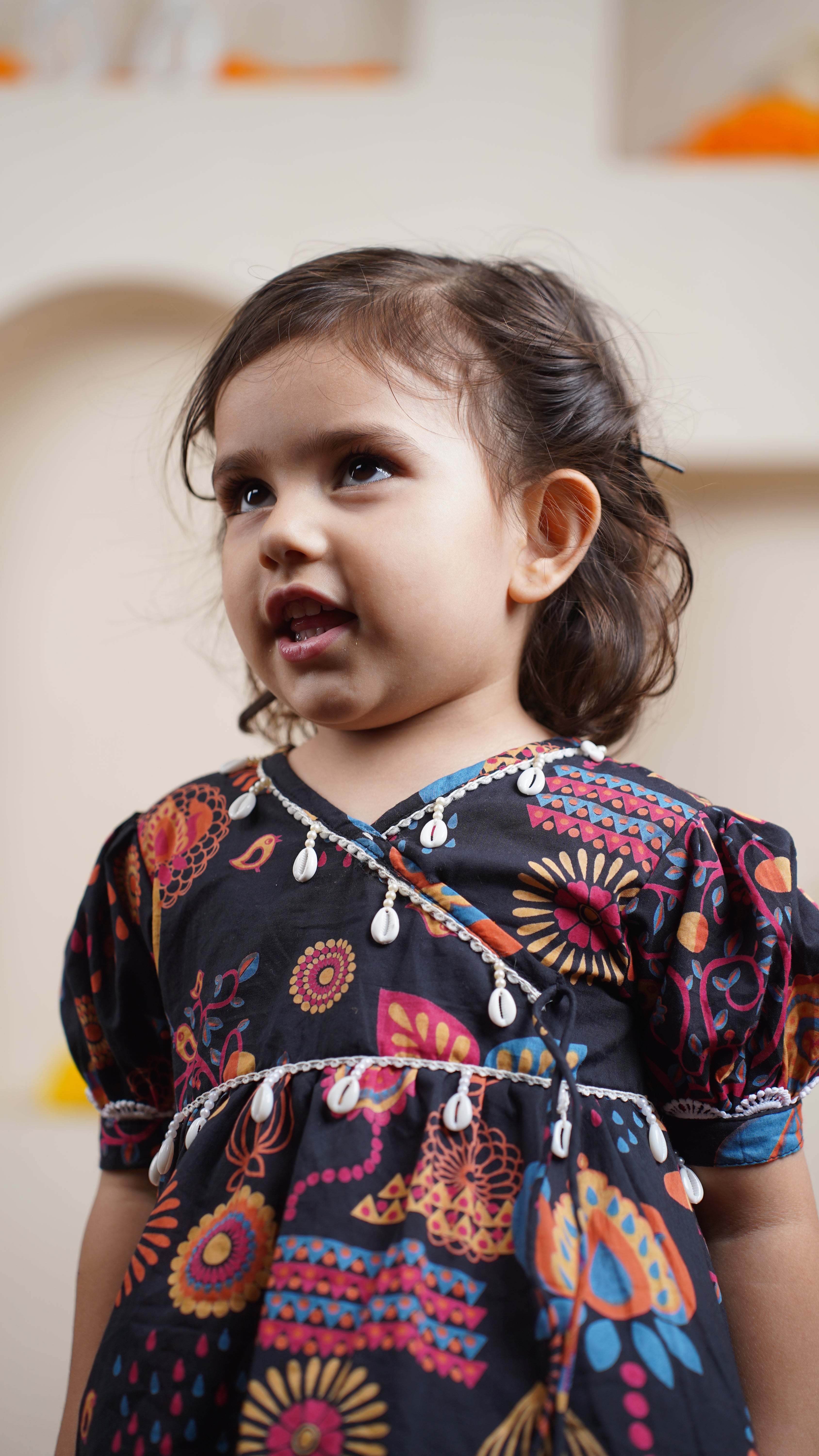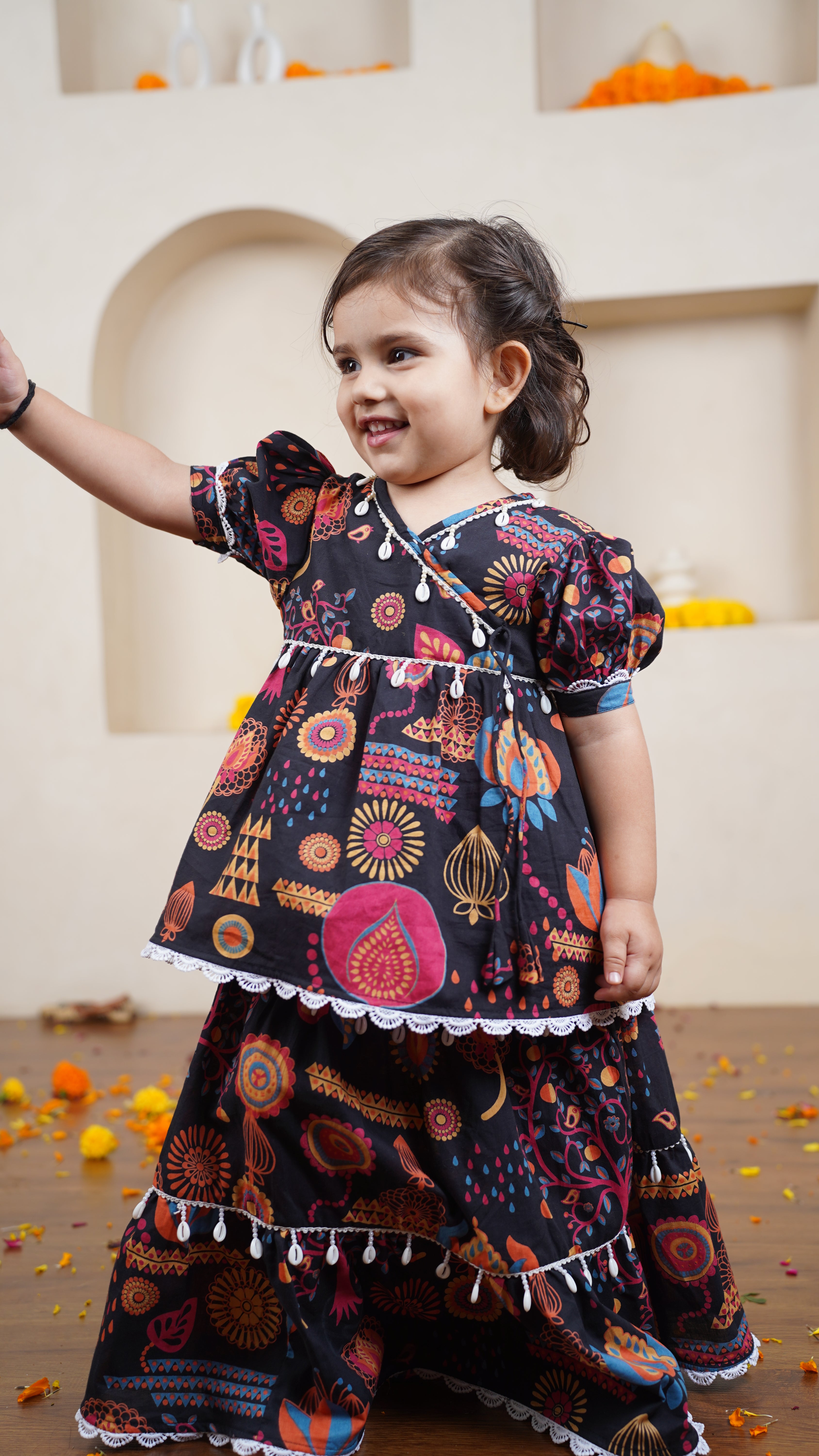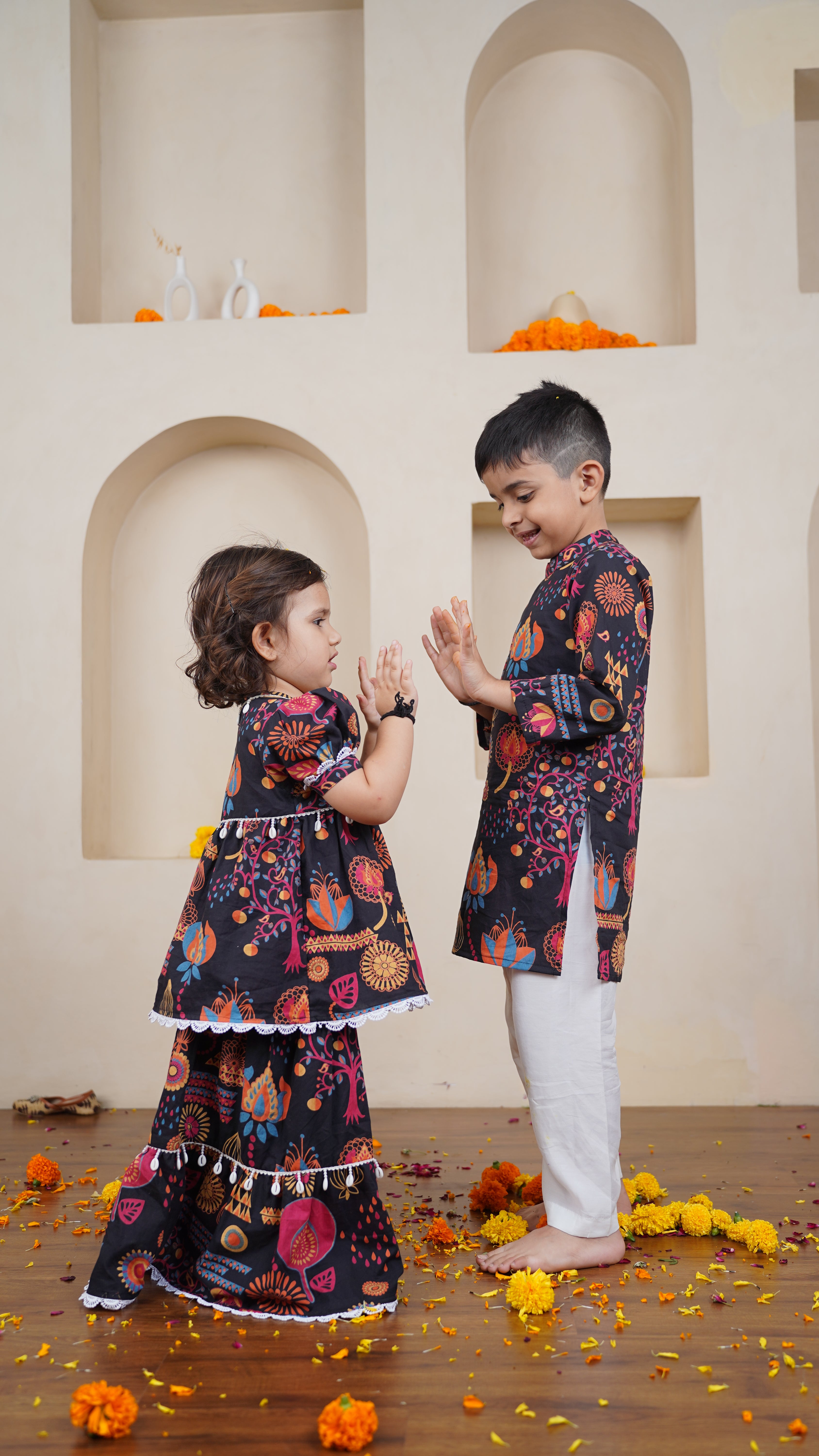 Bright and full of festive charm, our Midnight Festival Skirt Set brings fun and color to every celebration. Crafted from soft cotton, the kurta features a vibrant hand-illustrated print inspired by traditional motifs, set against a bold black base. Paired with comfortable white pajamas, it’s perfect for festive occasions, family functions, or twinning moments with siblings.