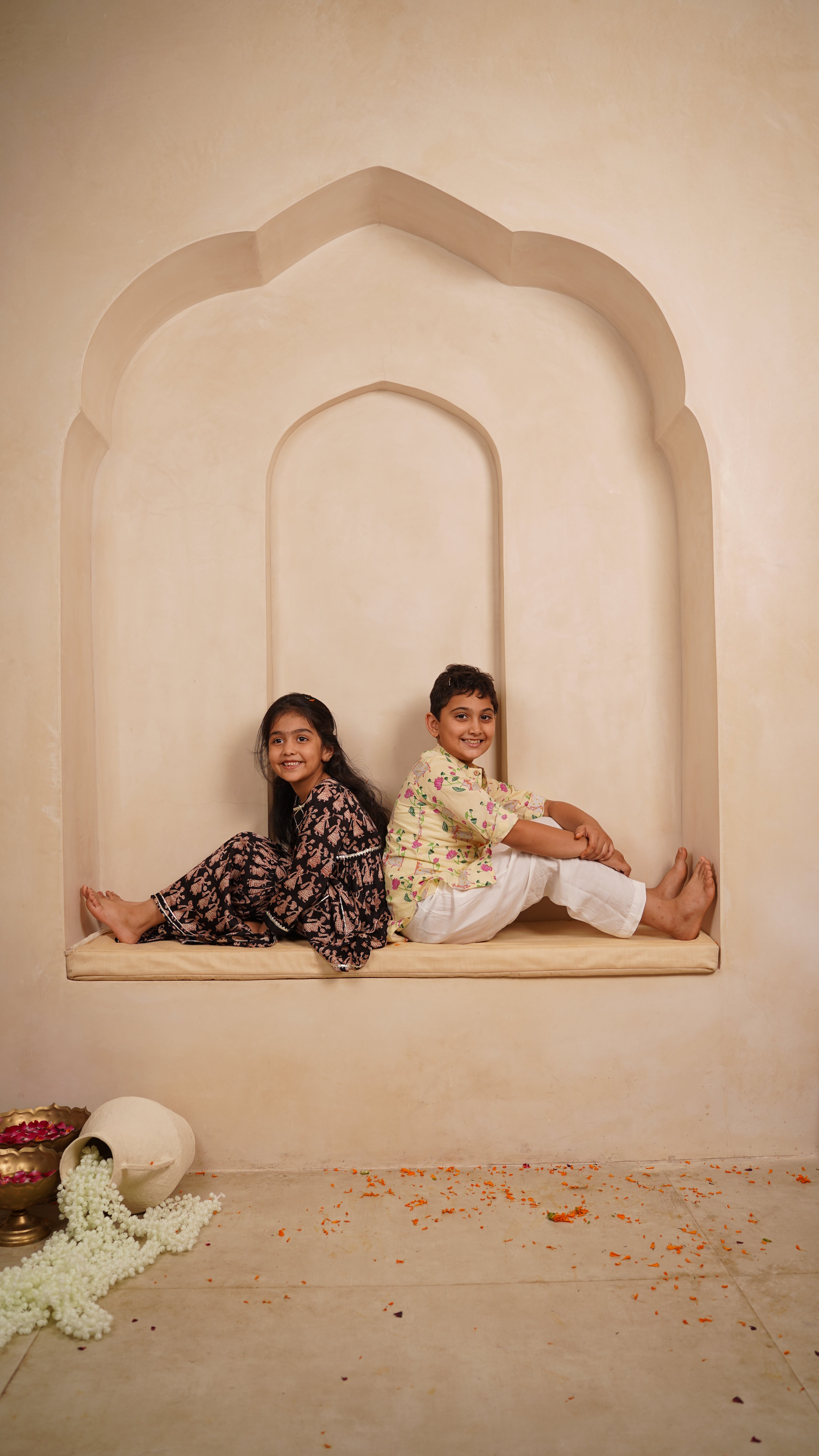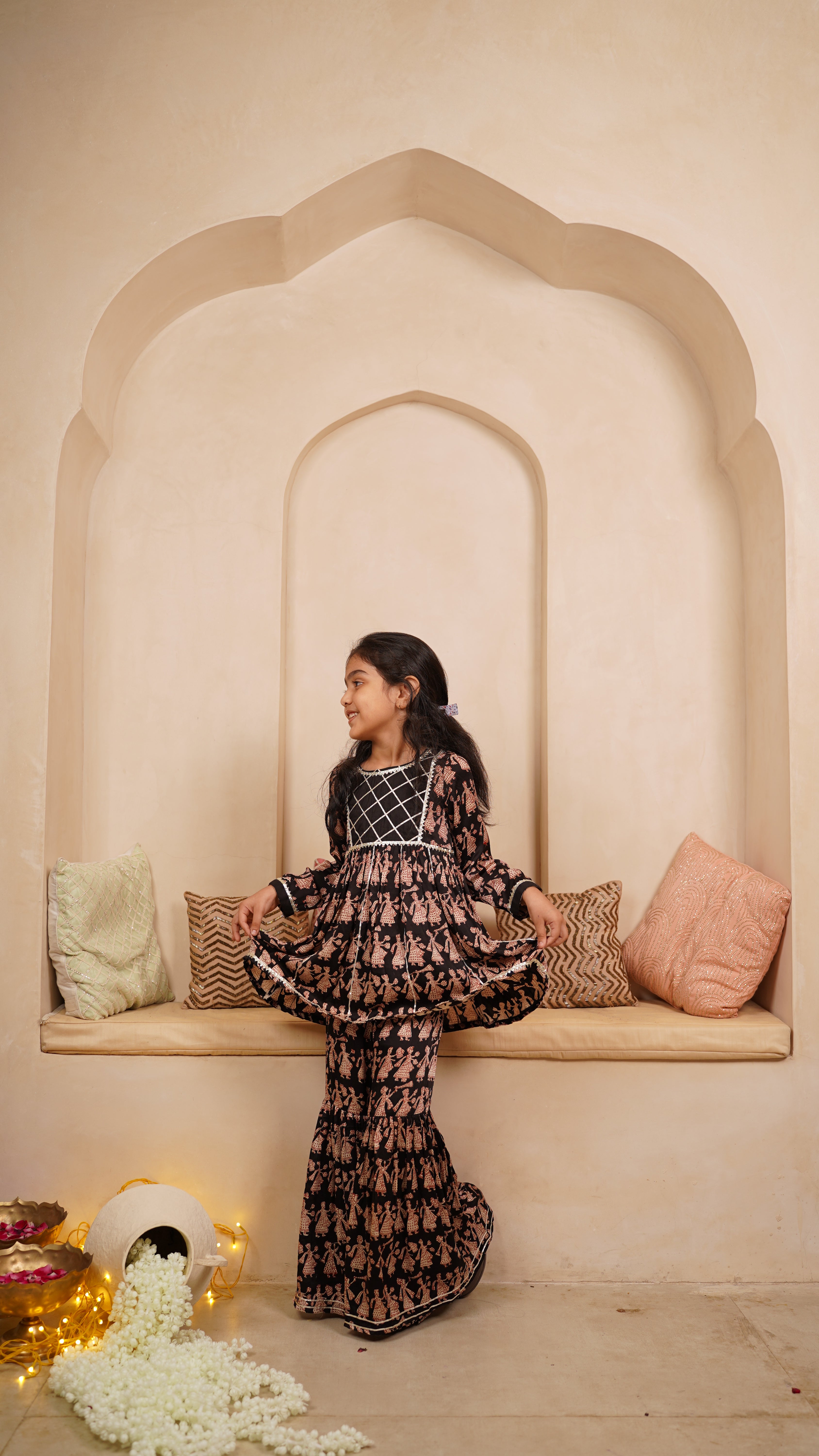 Let your little one shine in our elegant Mini Maharani Set, crafted in soft cotton with intricate hand block prints featuring traditional Rajasthani motifs. The flared peplum kurta paired with matching sharara pants brings a perfect blend of comfort and royal charm. Finished with delicate gota detailing, this outfit is ideal for festive gatherings, weddings, and joyful celebrations.