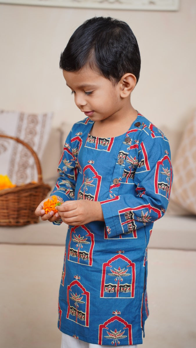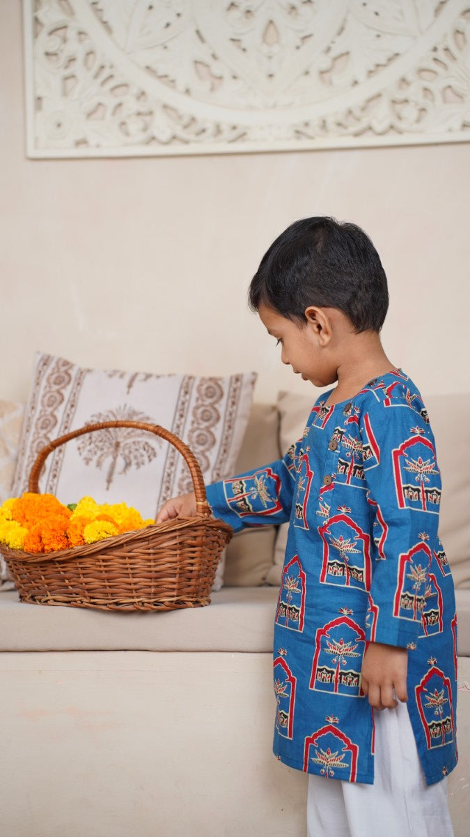 Let your little one shine in timeless tradition with our handcrafted boys' cotton kurta in a vibrant royal blue. Inspired by heritage architecture, this kurta features intricate arch motifs and symbolic tree designs — bringing a touch of culture and color to festive wear. Pair it with white pajamas or dhoti pants for the perfect traditional look!
