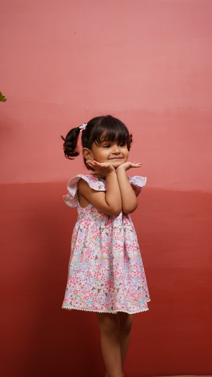 Bright, breezy, and full of charm — the Petal Pink Frock is made for your little one’s happiest days! Crafted in soft cotton blend with a dainty floral print, this sleeveless flutter dress is as comfy as it is cute. The pastel hues and delicate lace hem make it perfect for sunny outings, picnics, or birthday celebrations.