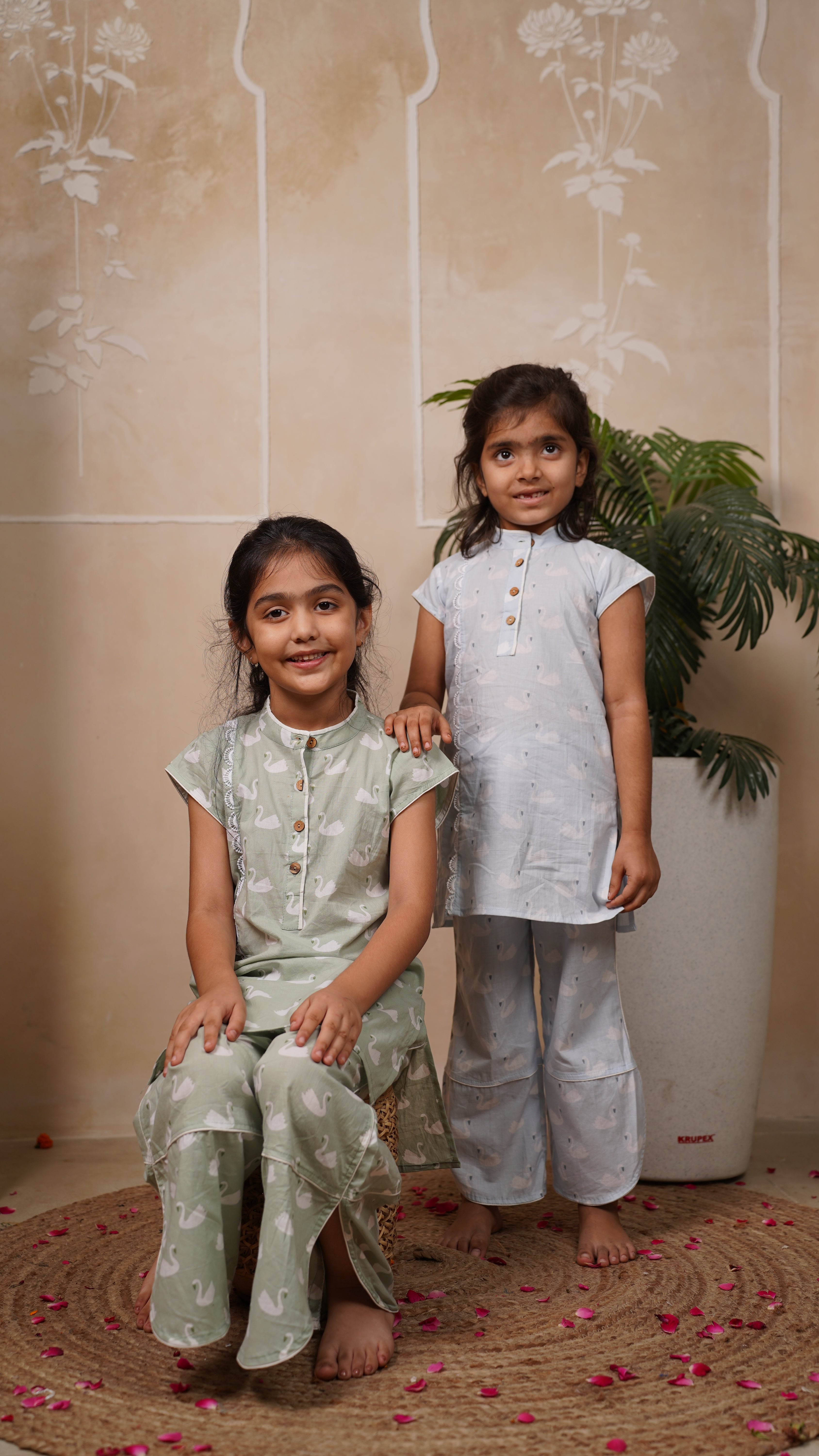 Let your little one shine in our Sky Swan Kurta Set, crafted in soothing sage green cotton...