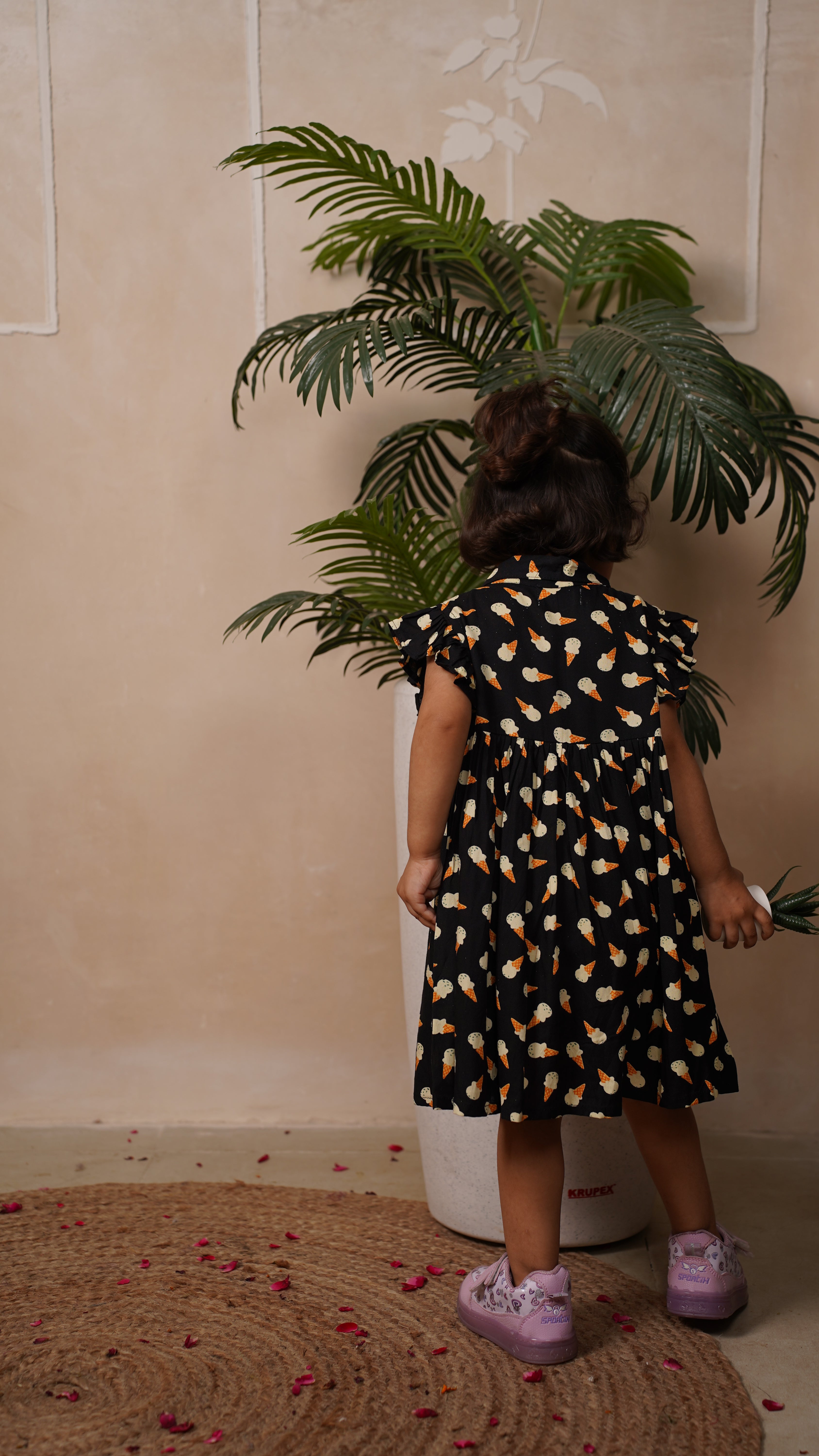 Sweet, playful, and full of charm — our Ice Cream Delight Frock is made for sunny days and happy moods! Crafted from 100% soft cotton, this black dress features colorful ice cream prints and ruffled sleeves that make every twirl extra fun. Perfect for casual outings, playdates, or a fun family day out.