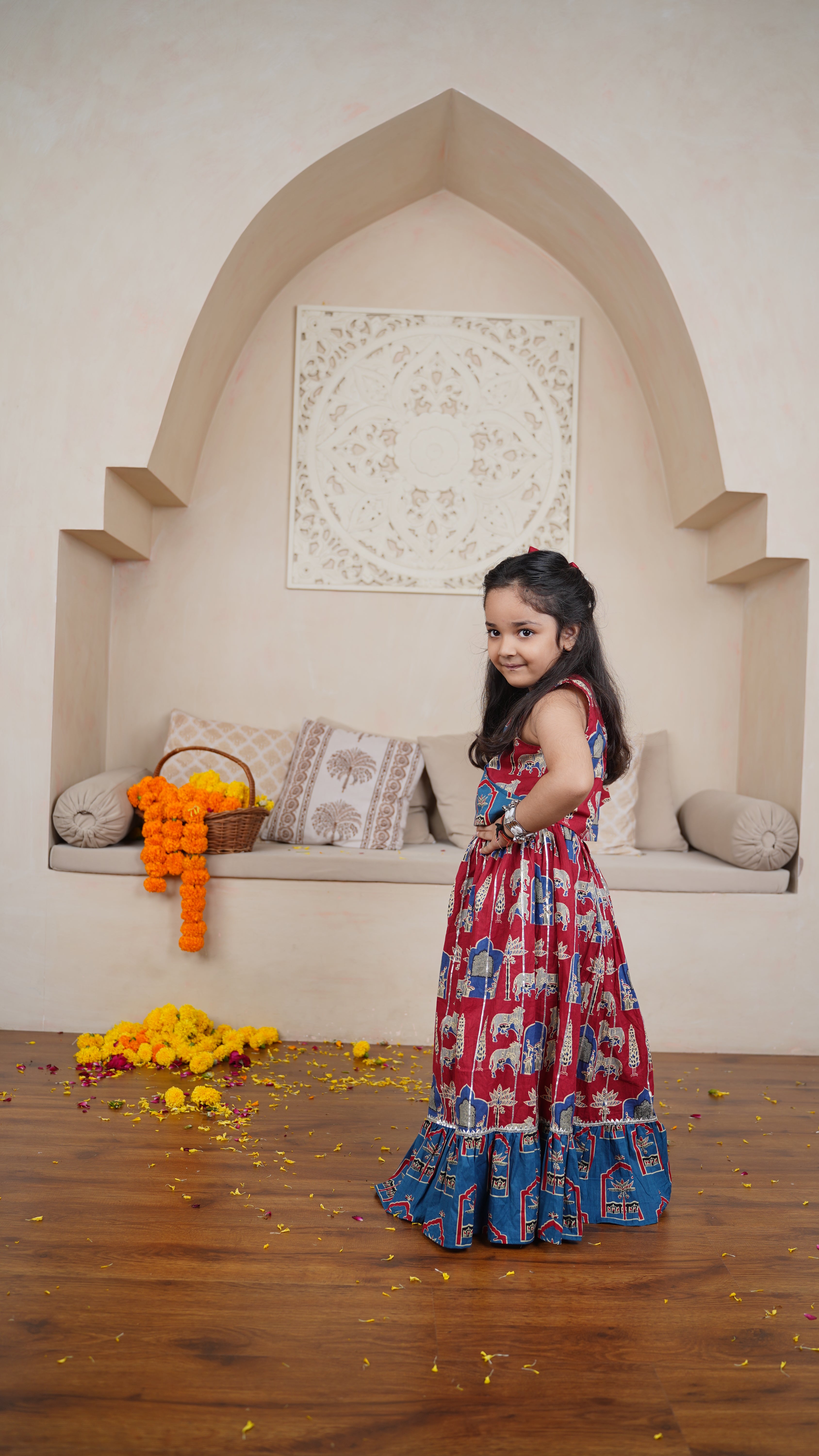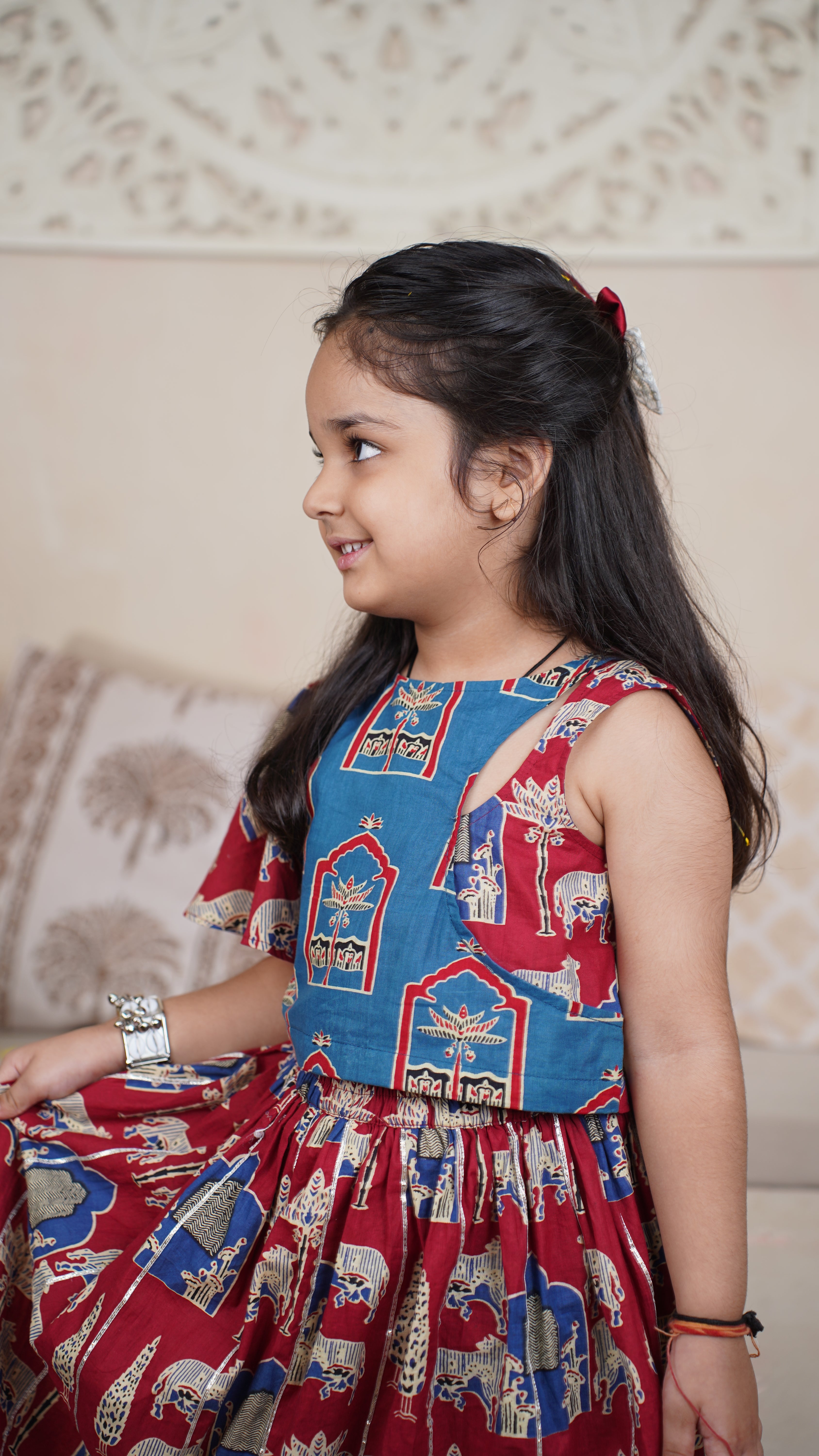 Make your little one stand out with this beautifully designed Rang Mahal Skirt Set. Featuring charming block-inspired animal and motif prints, this outfit blends traditional aesthetics with a playful modern twist. The asymmetric neckline with one puff sleeve adds a fun and trendy touch, while the gathered flare and contrasting blue border at the hem create a graceful flow. Crafted from soft, breathable cotton, it ensures all-day comfort and ease of movement—perfect for festive celebrations, family events, or casual outings.
