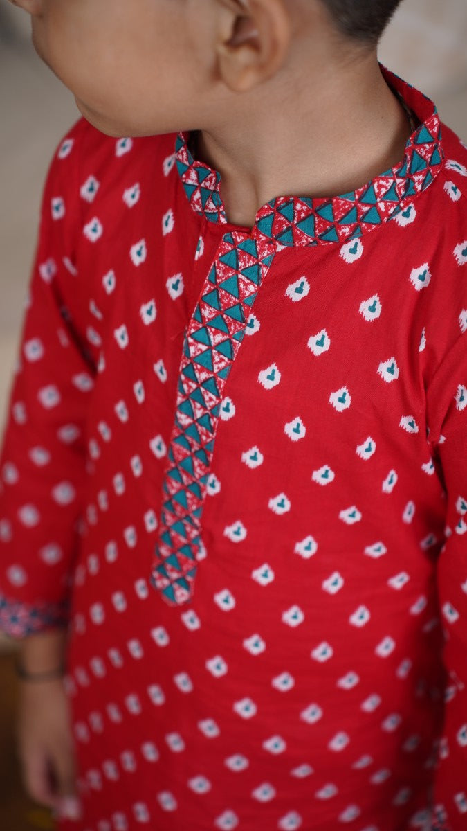 Celebrate traditions in timeless style with our Red Blossom Kurta Set. Crafted from premium cotton, this kurta features a classic motif print accentuated with contrast detailing on the neckline and cuffs. The relaxed silhouette ensures all-day comfort, while the white pajama adds a refined finish — perfect for festive gatherings and special occasions.