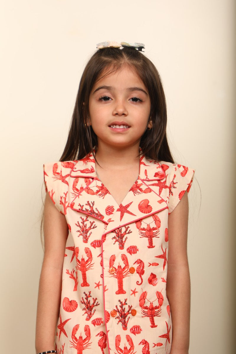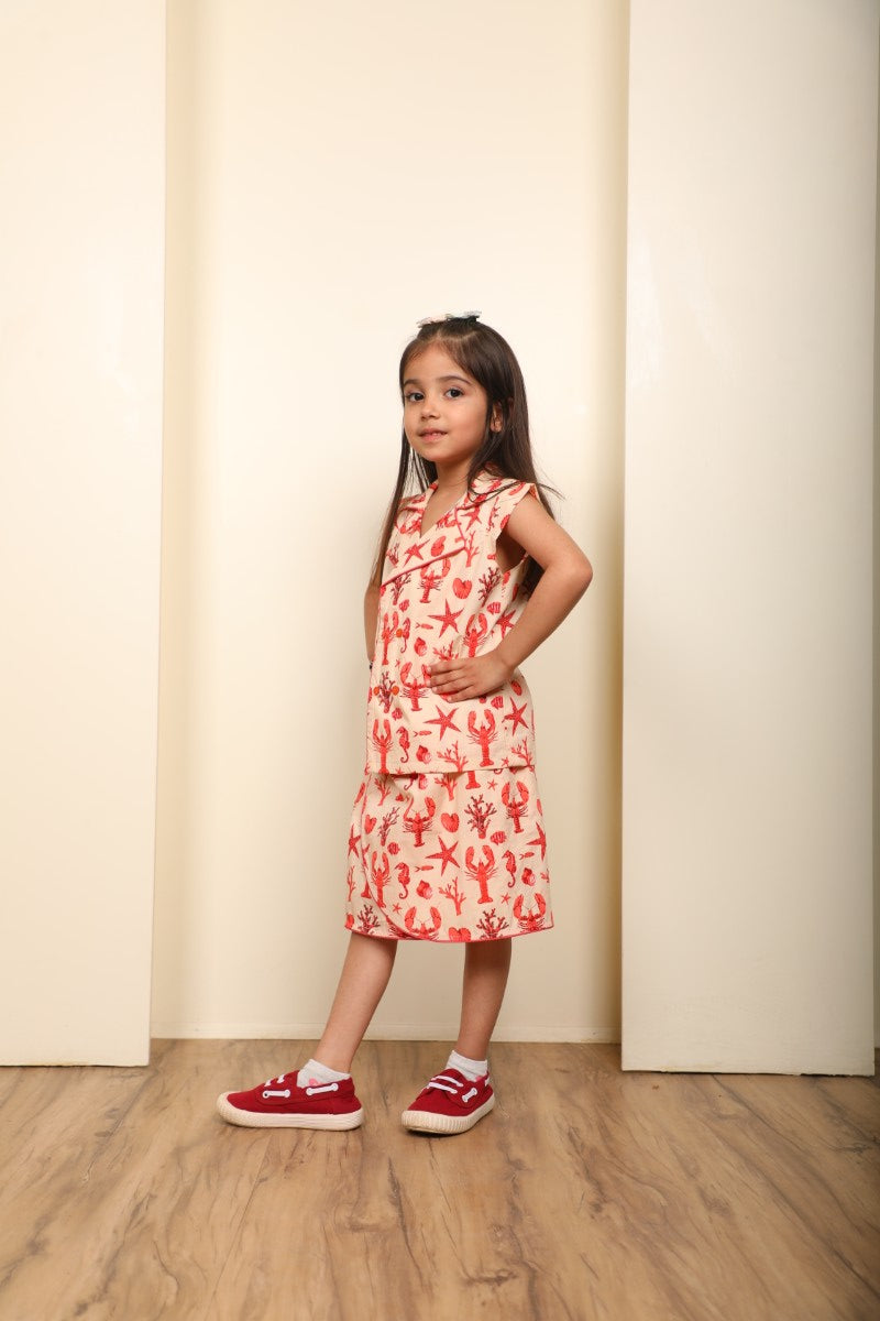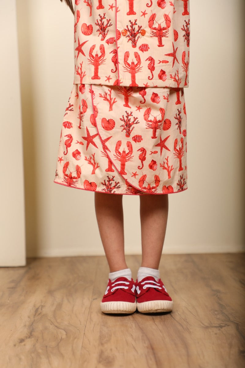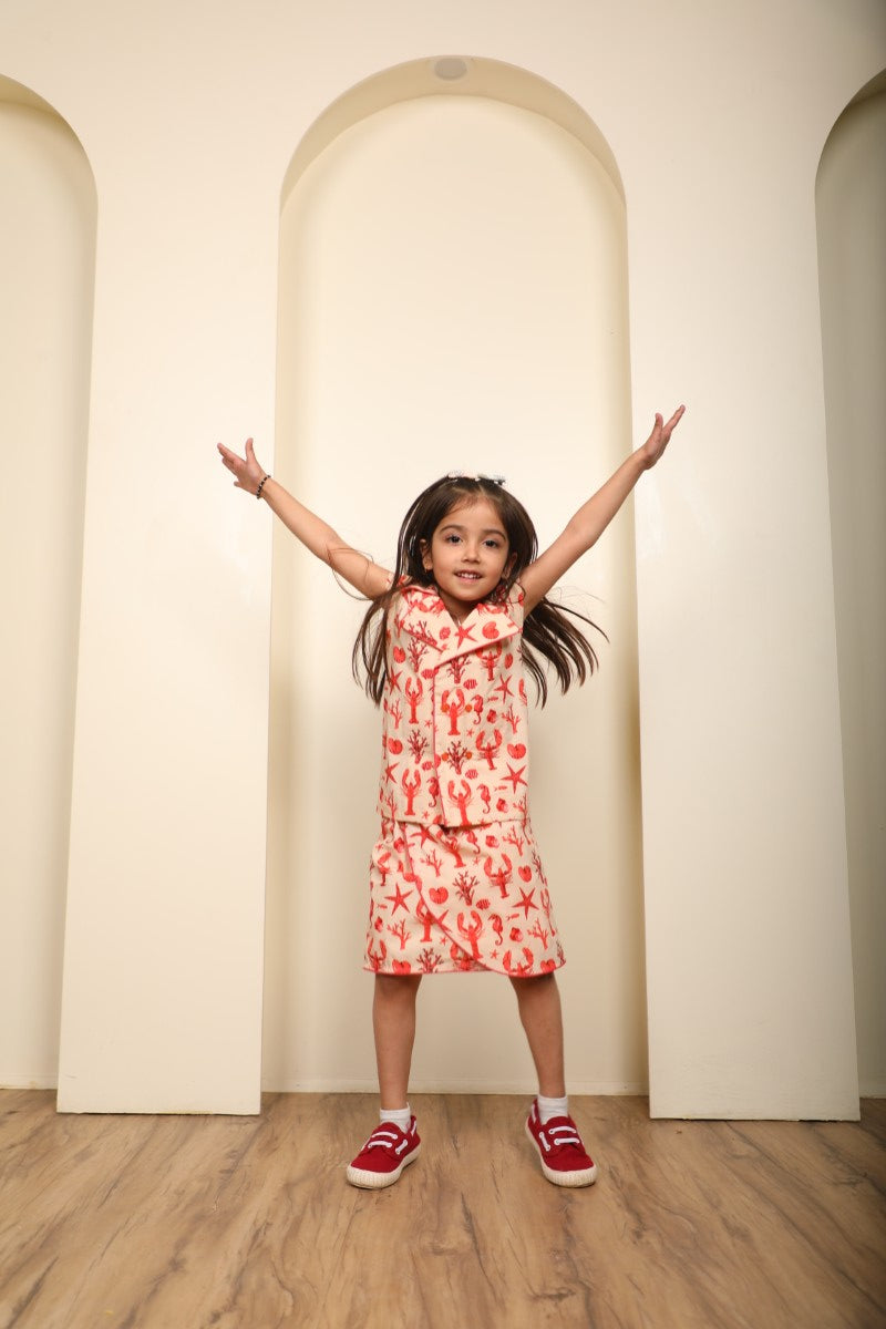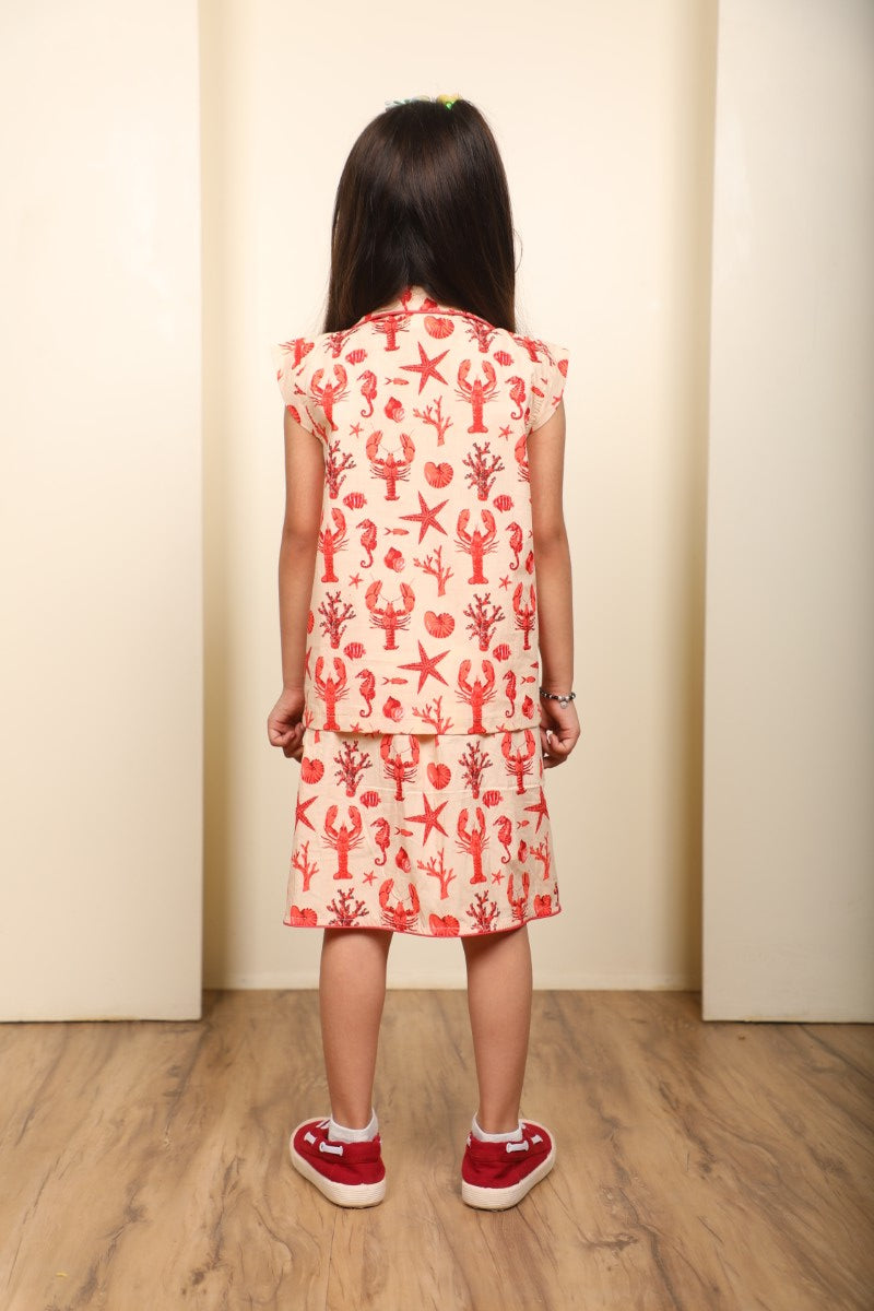 A super cute co-ord set for your little fashionista! This outfit features a matching printed top and skirt in a soft peach base with vibrant ocean motifs — starfish, corals & seashells — perfect for a fun and playful look.